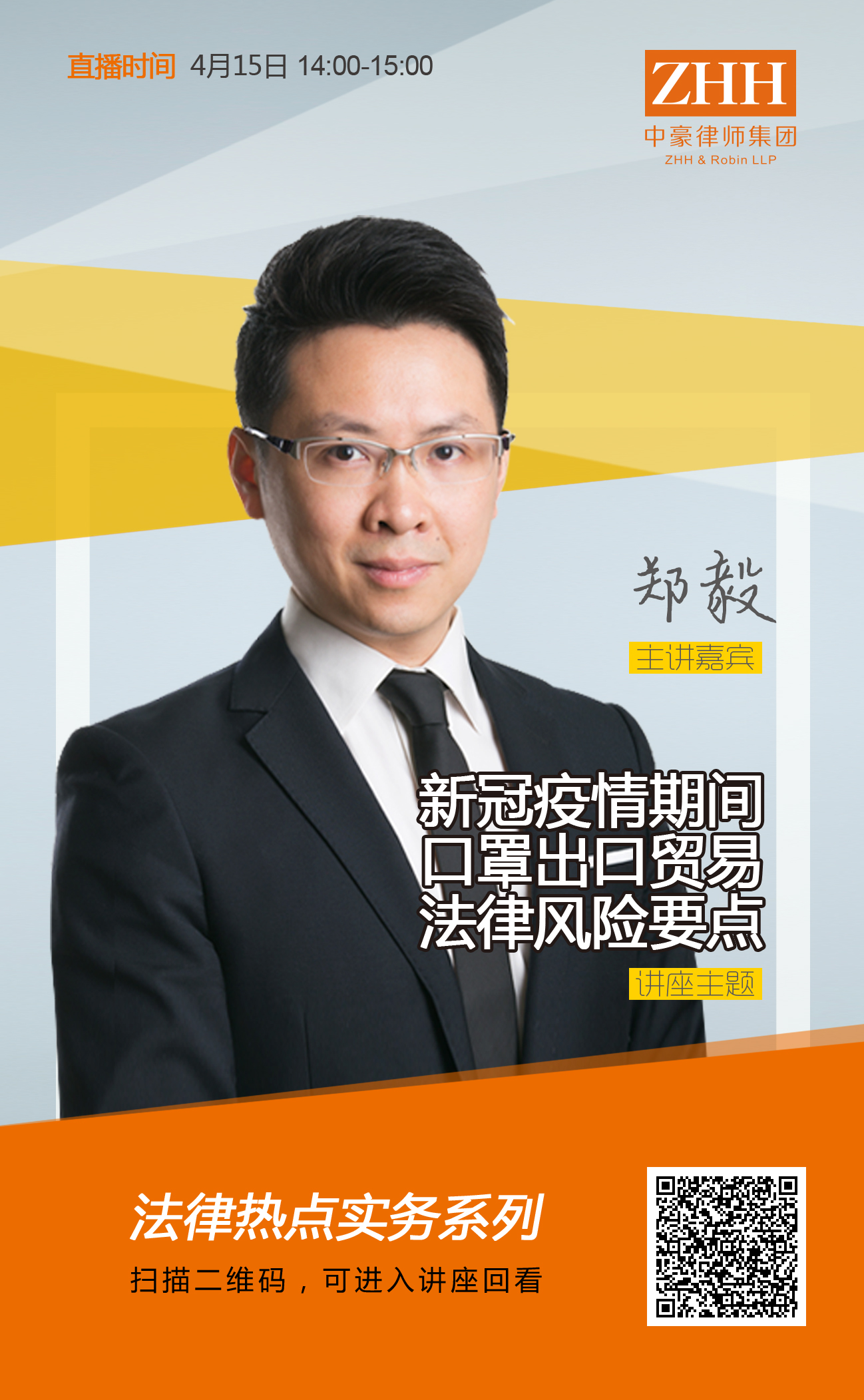 扫描海报中二维码,可进入“新冠疫情期间口罩出口贸易法律风险要点”讲座回看。